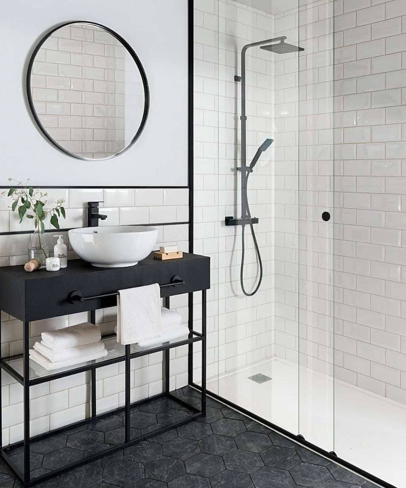 White subway tiles are amazing for using all over the bathroom, rock them with black grout for a bold look, and with white grout for a seamless look.